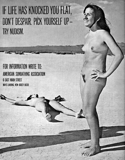 "If life has knocked you flat, don't despair. Pick yourself up - Try nudism."