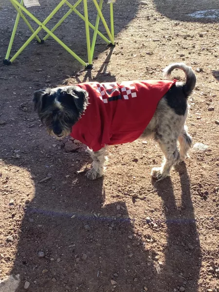 "Gizmo was cold while camping. So I made him a sweater out of a kids shirt"